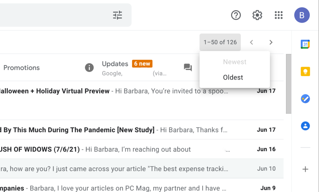- Gmail အရေအတွက်ကို ပြတဲ့ အပေါ်ညာဘက်ထောင့်မှာ ( “1-50 of 2,000.” ကဲ့သို့ တစ်ခုခု) ကို သွားပြီး “Oldest.” ကို ရွေးပါ။