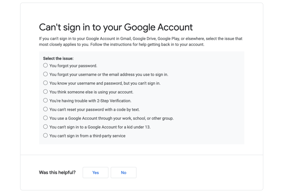 အကယ်၍ password ကို အမှန်တကယ် မေ့သွားတယ်ဆိုပါက (သို့မဟုတ်) အကောင့်ထဲသို့ အခြား အကြောင်းပြချက် တစ်ခုခုကြောင့် ဝင်လို့ မရရင် Google ရဲ့ recovery page သို့ သွားပြီး ၎င်းရဲ့ မေးခွန်းများကို စတင် ဖြေဆိုရမှာပဲ ဖြစ်ပါတယ်။ ရွေးချယ်နိုင်တဲ့ options တွေမှာ အသုံးပြုခဲ့တဲ့ နောက်ဆုံး စကားဝှက်ကို ဦးစွာ တောင်းဆိုတာ ဖြစ်ပြီး၊ ထို့နောက် အခြား အီးမေးလ်မှ အတည်ပြုကုဒ် တစ်ခု ၊ ဖုန်းမှ အတည်ပြုကုဒ်တစ်ခုနှင့် လုံခြုံရေးမေးခွန်းရဲ့ အဖြေအတွက် အမှန်တကယ်ပဲ အကန့်အသတ်တွေ ရှိပါတယ်။ “Can’t sign into your Google Account” page ကို သွားပြီး အခြား ရွေးချယ်စရာ options ရှိမရှိ ကြည့်ဖို့ ကမ်းလှမ်းထားတဲ့ ရွေးချယ်မှု options တစ်ခု (သို့မဟုတ်) တစ်ခုထက် ပိုတဲ့ ရွေးချယ်စရာ options များကို ရွေးချယ်နိုင်ပါတယ်။ ဒါပေမယ့် Google ရဲ့ bots တွေ တောင်းဆိုတဲ့ အချက်အလက်တွေကို ထည့်နိုင်တယ် ဆိုရင်တောင် လုံလောက်မှာ မဟုတ်ဘူးဆိုတာ သတိပြုစေချင်ပါတယ်။